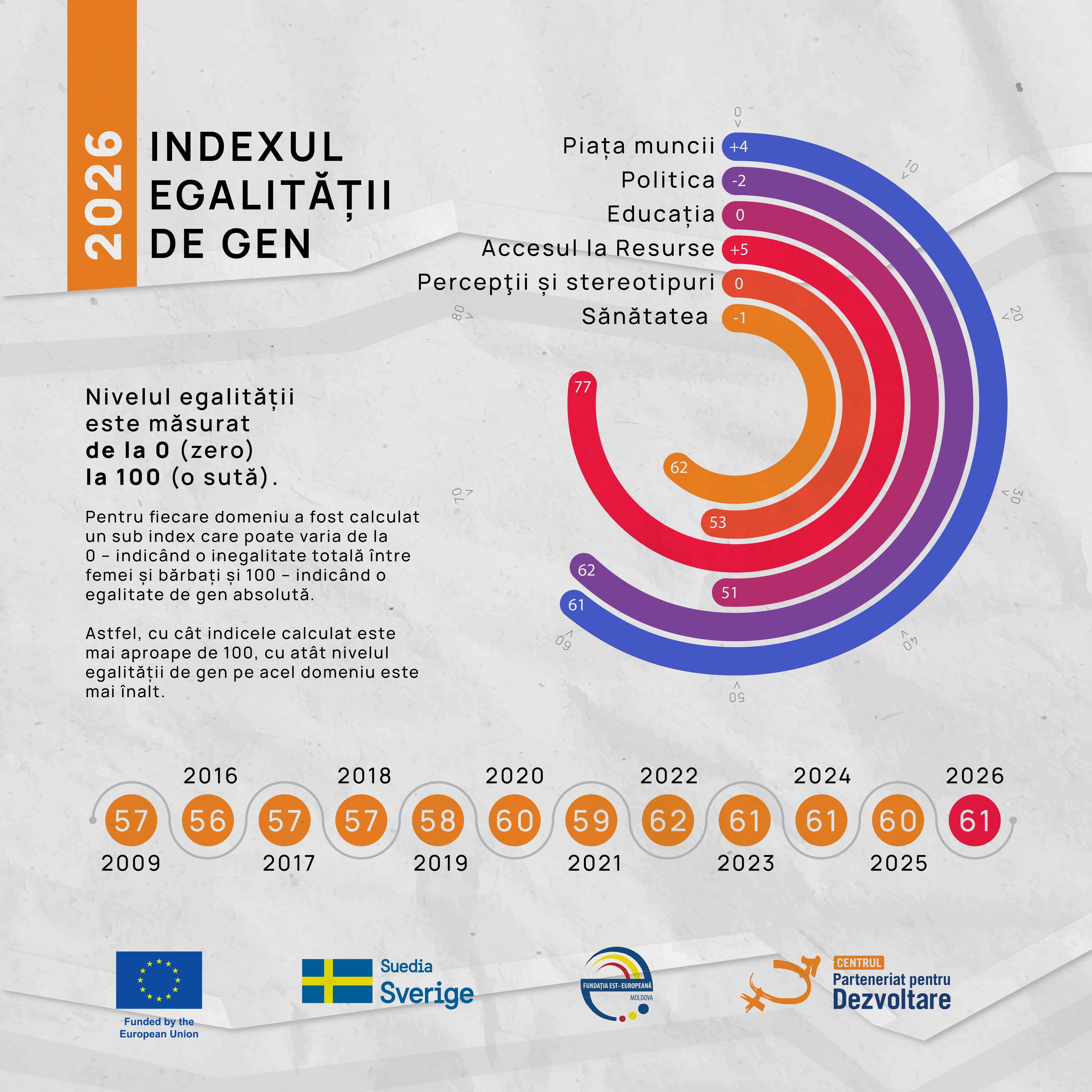 Despre publicație: Indexul Egalității de Gen 2026 este realizat de Centrul Parteneriat pentru Dezvoltare (CPD), cu susținerea financiară a Uniunii Europene și cofinanțarea Suediei, în cadrul proiectului „Implicarea civică pentru împuternicirea tinerilor și a femeilor”.