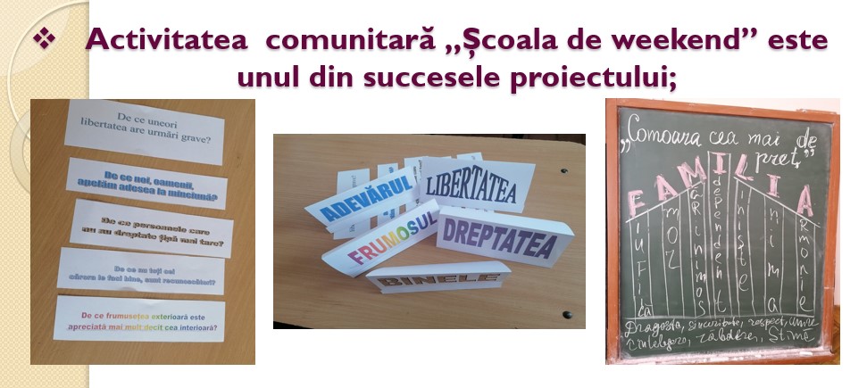 Prin implementarea proiectului locuitorii satului au obținut un serviciu public foarte important de socializare, educare, creștere și dezvoltare a copiilor, adolescenților și tinerilor – ”Școala de weekend”. Beneficiarii țintă ai serviciului sunt peste 100 de copii neinstituționalizați și părinții lor. Prin aceasta, s-a depășit dificultatea de marginalizare a acestei categorii de locuitori. Durabilitatea serviciului ”Școala de weekend” va fi asigurat în cadrul unui parteneriat cu centrele Comunitare ”Nadejda” pentru persoanele cu dizabilități și în etate și ”Casa în care mă simt copil” pentru copiii din familiile defavorizate, care au o componentă de promovare a voluntariatului în asigurarea incluziunii categoriilor de locuitori.